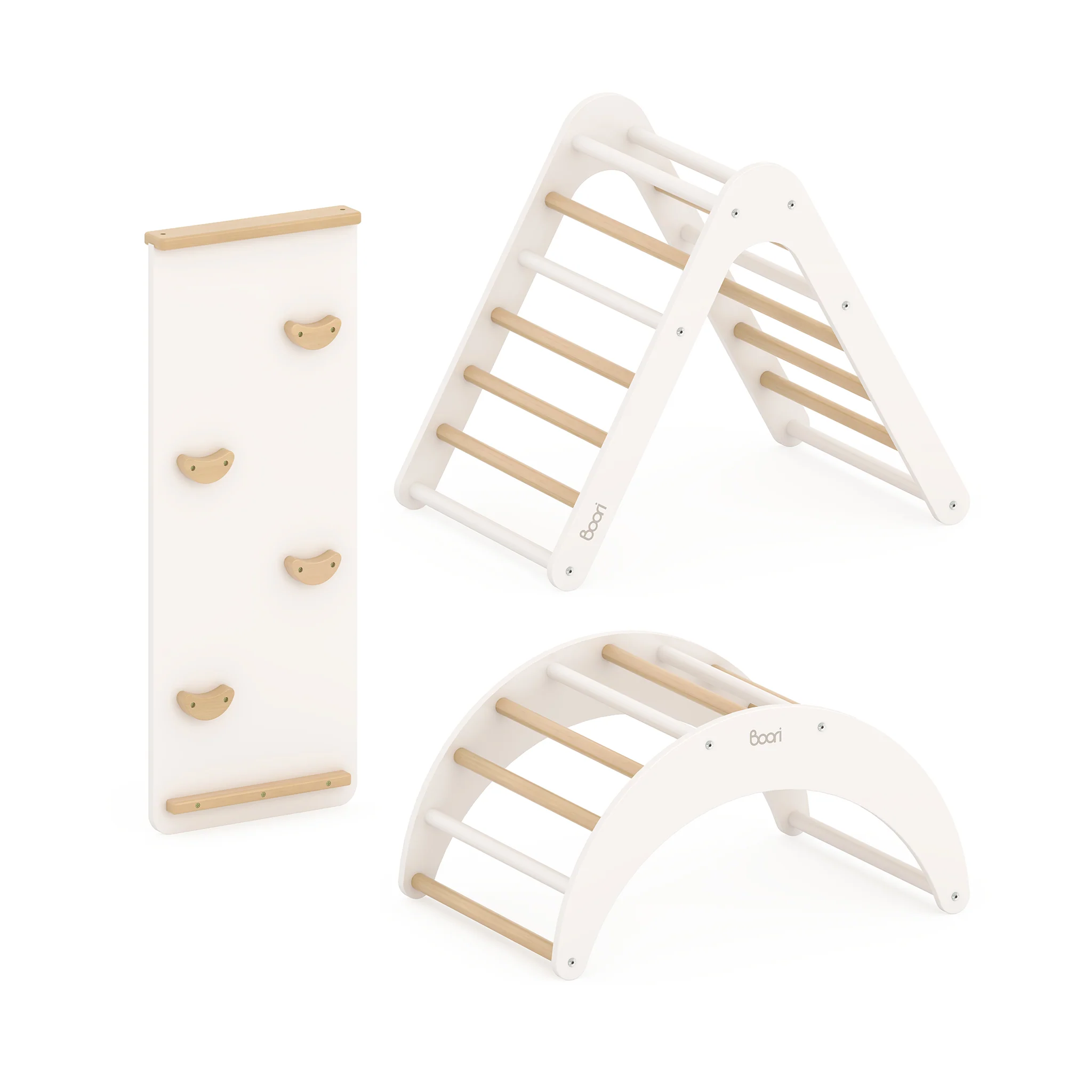 The classic indoor Pikler Triangle was first designed by eminent pediatrician Dr Emmi Pikler over 100 years ago! This set includes the classic climbing triangle as well as our unique climbing arch which can also be turned over for use as a balance board. it's designed to encourage children to learn to navigate at their own pace, developing their motor skills, physical strength and agility. The ramp can be used as a bridge between the two frames, as a climbing ramp or even as a mini slide.