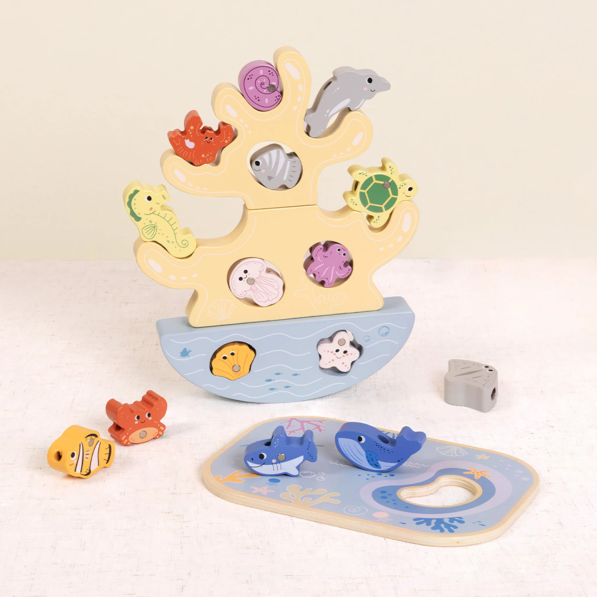 Embark on a pretend-play fishing adventure with this multi-functional wooden play set. By combining the thrill of a magnetic fishing expedition with the intricate challenge of lacing and the creative strategy of stacking, this toy offers a comprehensive sensory experience.