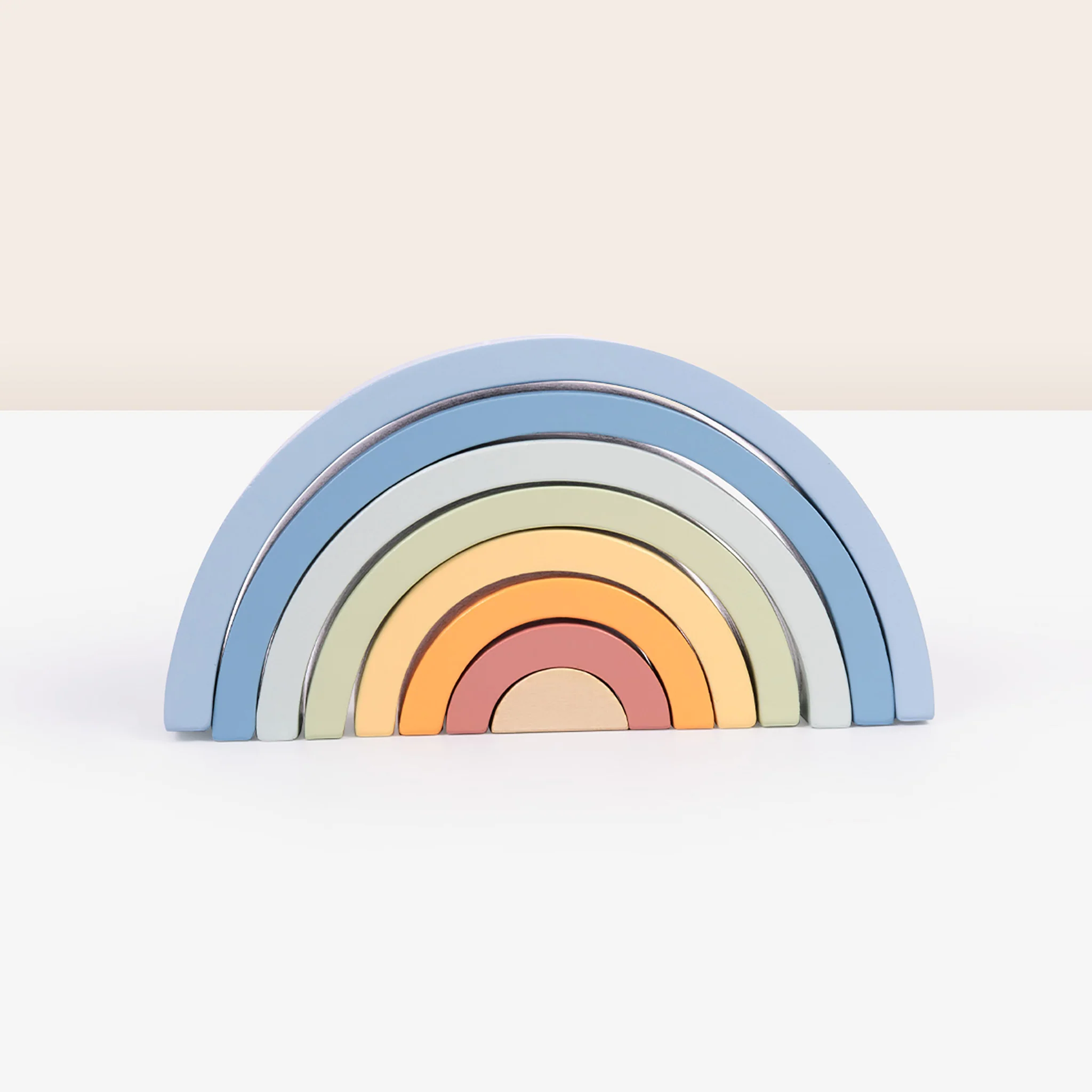 The Tooky Toy Wooden Rainbow Stacker is a vibrant, multi-functional set designed to playfully stimulate a child's imagination and fine motor skills through endless building possibilities. Whether stacking the arches, creating unique shapes, or using them as tunnels and bridges for other toys, children are encouraged to invent and explore at their own pace. Aligned with Montessori principles, this open-ended toy promotes self-directed learning and problem-solving without the constraint of fixed rules. Each piece is crafted from a combination of pine and plywood, and finished with beautiful muted colours. Suitable for children 18 months+